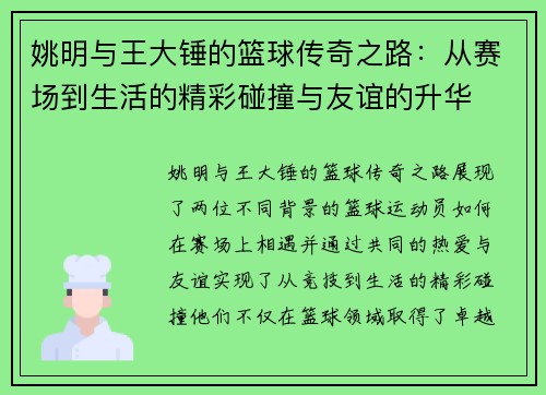 姚明与王大锤的篮球传奇之路:从赛场到生活的精彩碰撞与友谊的升华