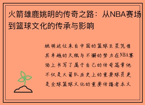 火箭雄鹿姚明的传奇之路:从NBA赛场到篮球文化的传承与影响